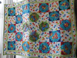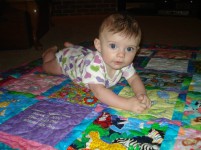 You can be the best Grandmom or Aunt in the world when you give that special child an I-Spy quilt. Babies love color and shapes and playing games while learning and this quilt makes it easy. Use it as part of 'tummy time'. It can be thrown on the floor, washed and dried like any other cotton fabric is and they will know it's all theirs if you want it personalized with an embroidered block that has the baby's name, date of birth, length and weight and a special message as part of the label on the back
