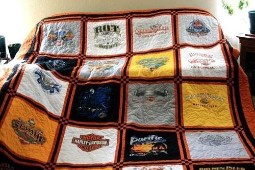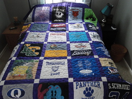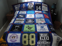 Do you own treasured t-shirts that you just can't bear to throw away? We can turn your old clothes into lasting memories in the form of fun and functional t-shirt quilts. Don't forget friends and family. Consider special occasions like graduation or a house-warming party. This is a gift that will be cherished and functional. Who do you know with a drawer full of old t-shirts? Review our photos below and see just how beautiful a t-shirt quilt can be. Check our order form to determine the number of t-shirts needed to create the size and dimension you need. You have input into the color of the sashing and the color and choice of either cotton or flannel backing. If you have questions, we have an FAQ section right here on the website, but please don't hesitate to call. We specialize in personalization.