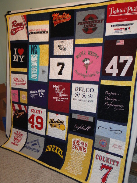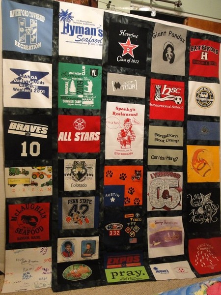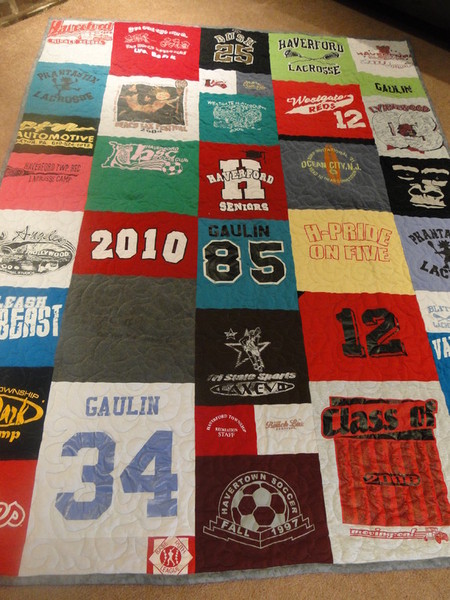 Gradulation gift for twin boys: When you've gone to the same school, participated in the same sports and even share a bedroom most of your lives, how do you separate yourself from your brother? You have bed quilts made from all of the t-shirts, sports jerseys and camp/vacation shirts...but to be different, the layout is not the same and the sashing in between the shirts as well as the little corner stone patches are done in the school colors of the Colleges you will be attending. Same in many ways but totally 'yours' >