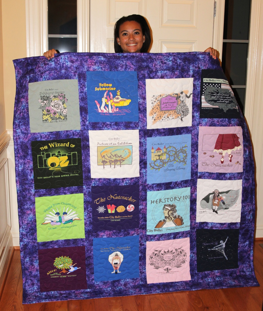 t-shirt quilts don't have to show what sports you were in. Nicole wanted to document, in her own special way, all of the dance recitals and performances she had participated in. 16 performances were captured in her lap-sized quilt and each shirt brought back memories of hard work, long practices and excitement when performing on stage. And to add a touch of whimsy, Nicole picked Purple to surround her shirts, adding a pop of color and personality.